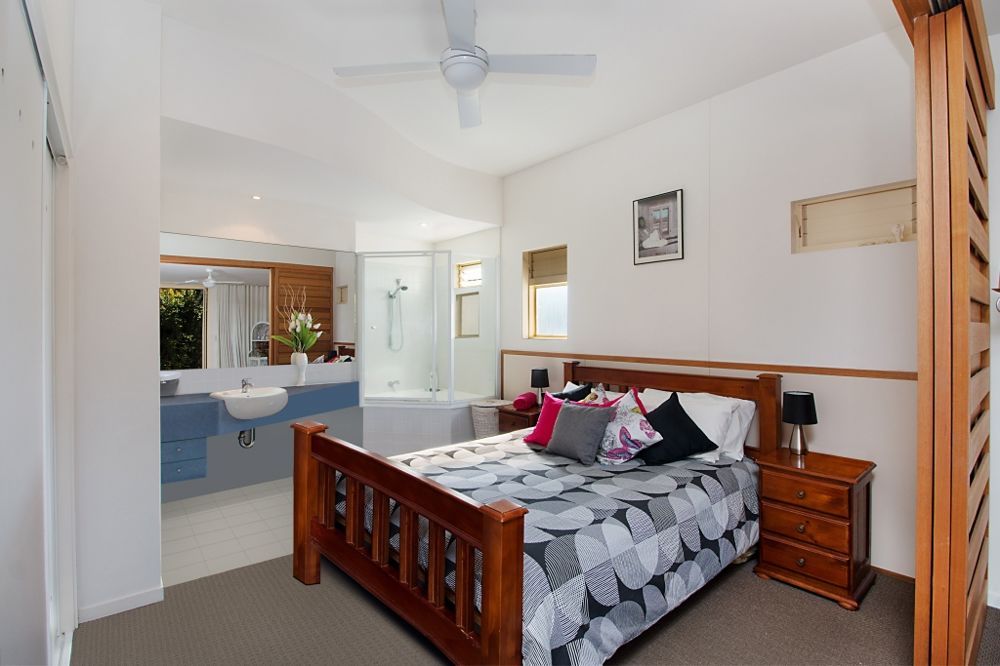 Master bedroom with open plan ensuite, built in robe and ceiling fan and shutters opening onto the air conditioned living area.