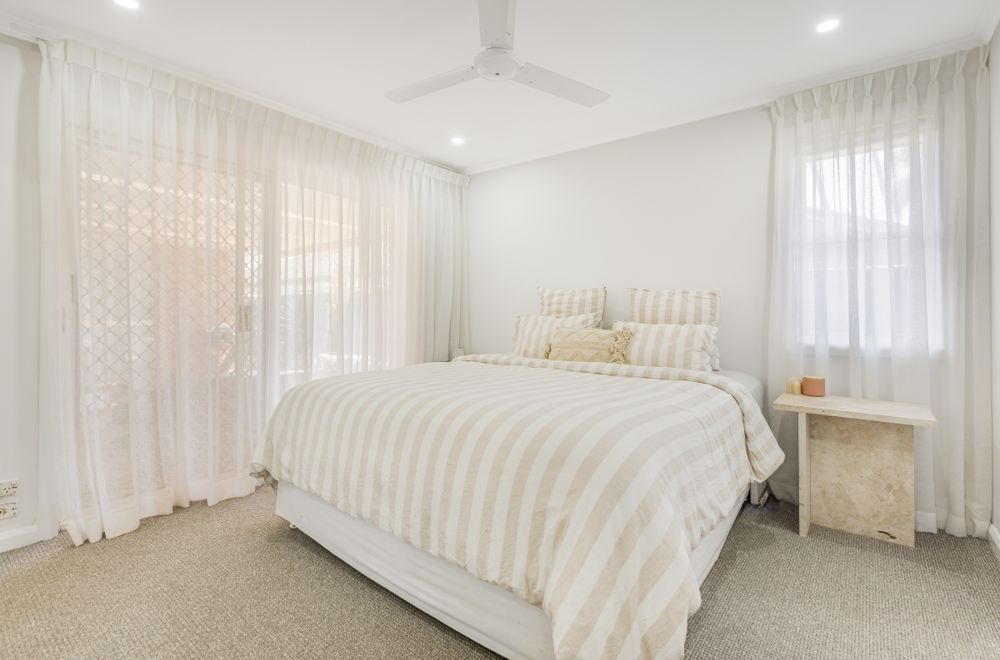 - Master bedroom with private, renovated ensuite, ceiling fan, mirrored built in robe & patio access