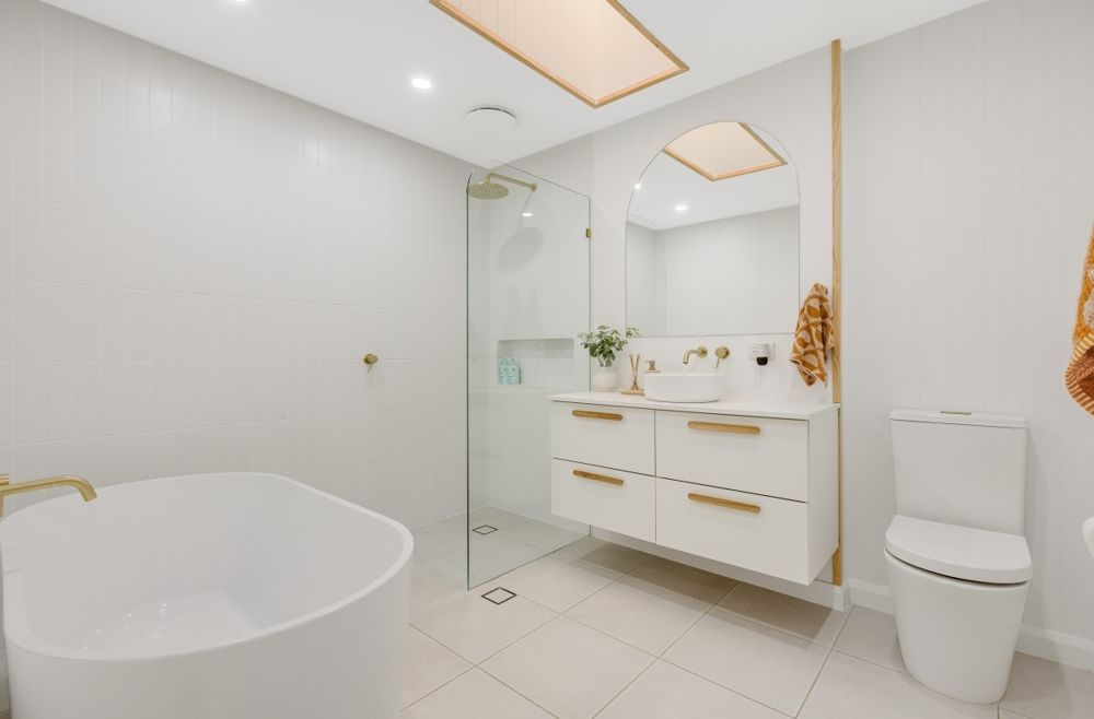- The beautifully renovated bathroom featuring a standalone bath and natural light from the large skylight