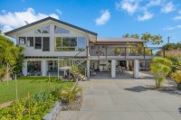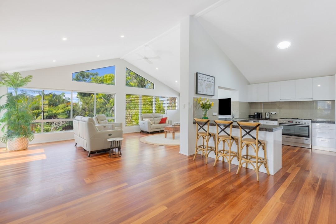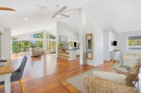 Upstairs, the main residence is filled with natural light and coastal charm, featuring soaring raked ceilings, rich timber floors, and timber shutters in the living space. The open-plan layout includes multiple zones, giving a large family room to relax, entertain and enjoy. The main living area enjoys a beautiful outlook over the pool and gardens, while tinted bi-fold stacker doors open seamlessly to a generous covered balcony.