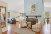 The kitchen is modern and central, complete with a gas cooktop, stainless steel appliances, a breakfast bar, rangehood, double-door fridge space, and abundant storage. A cosy fireplace adds warmth in the cooler months, and the upper level of the home enjoys a wonderful cross-breeze thanks to its clever design and elevated position.