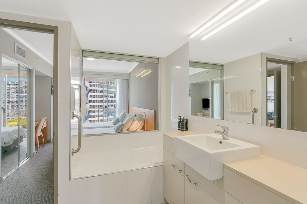 Bedroom features mirrored built-in wardrobes and ensuite with a bath