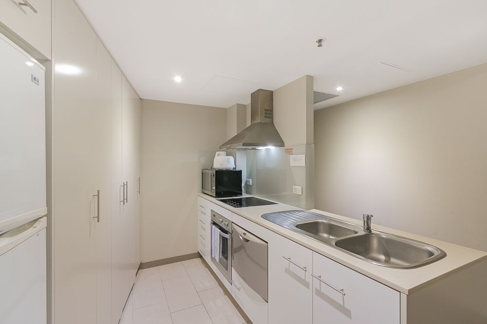 Kitchen equipped with a stone benchtop and stainless steel appliances