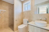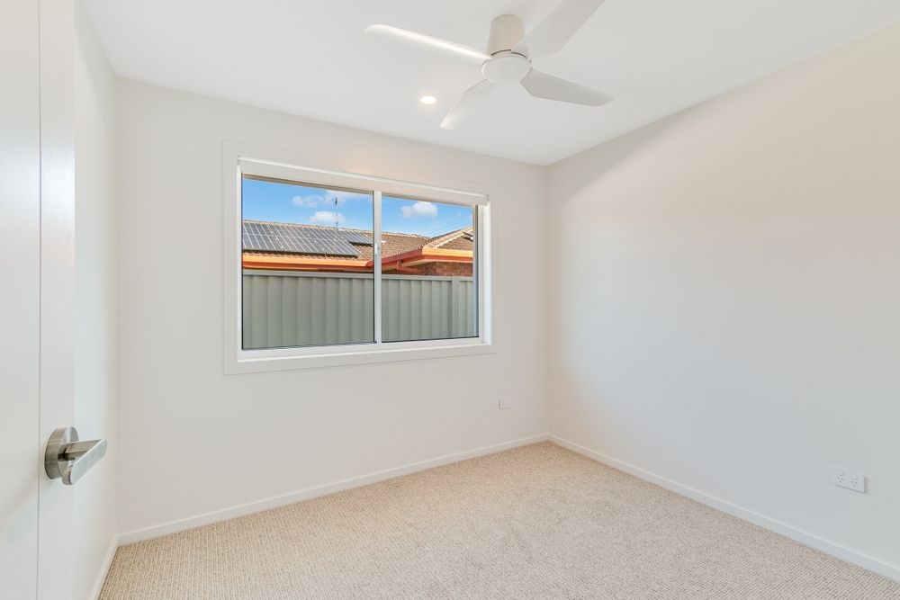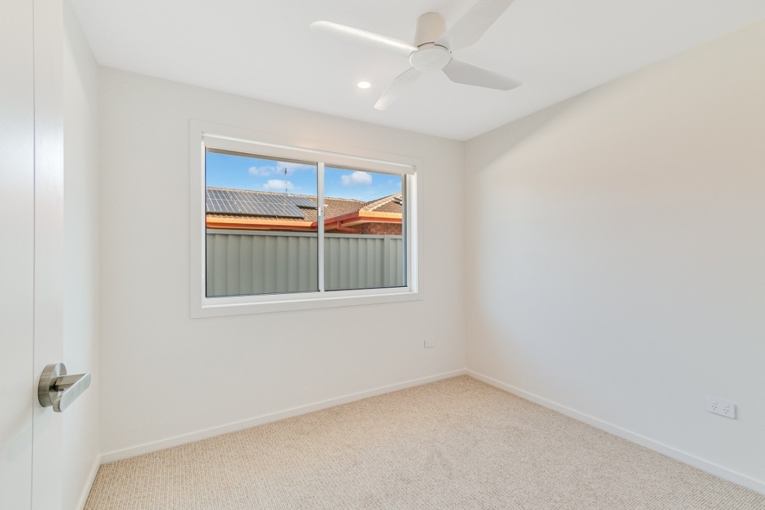 The villa features three spacious bedrooms, all with plush wool carpets and ceiling fans. The master suite includes a walk-in wardrobe, stylish ensuite, and air conditioning for year-round comfort. A separate family bathroom with a full bath and a well-equipped laundry enhance the home's easy-living appeal.