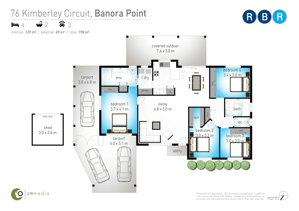 - Two additional bedrooms with built-in robes & ceiling fans