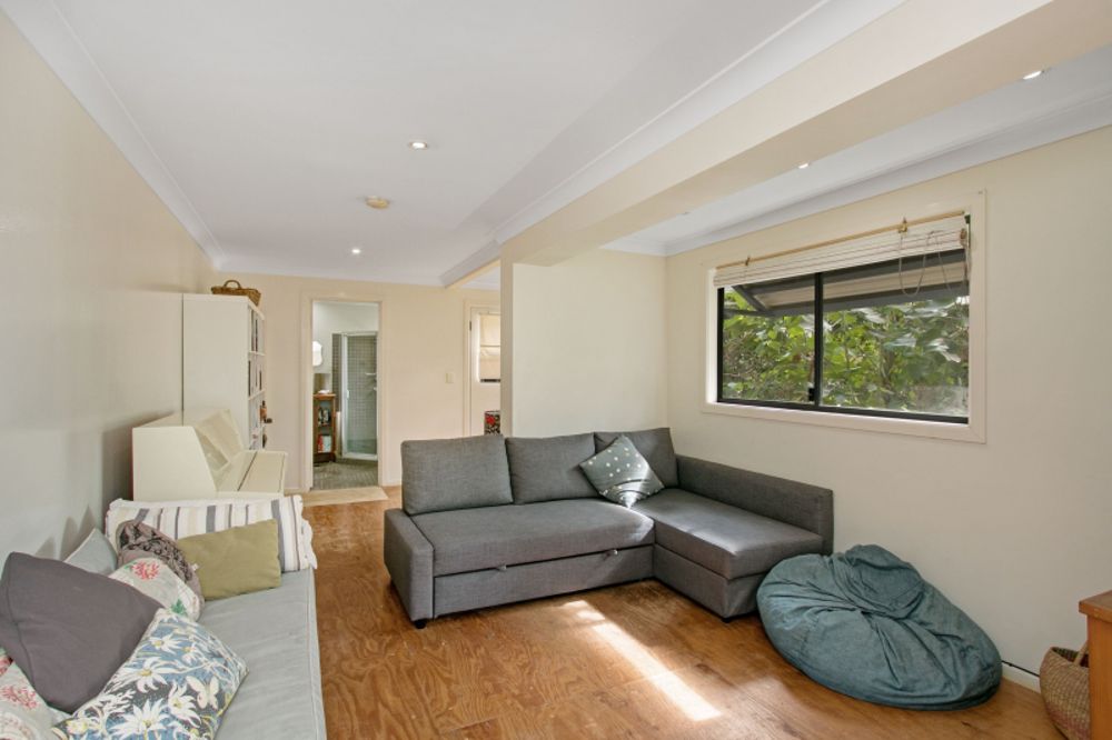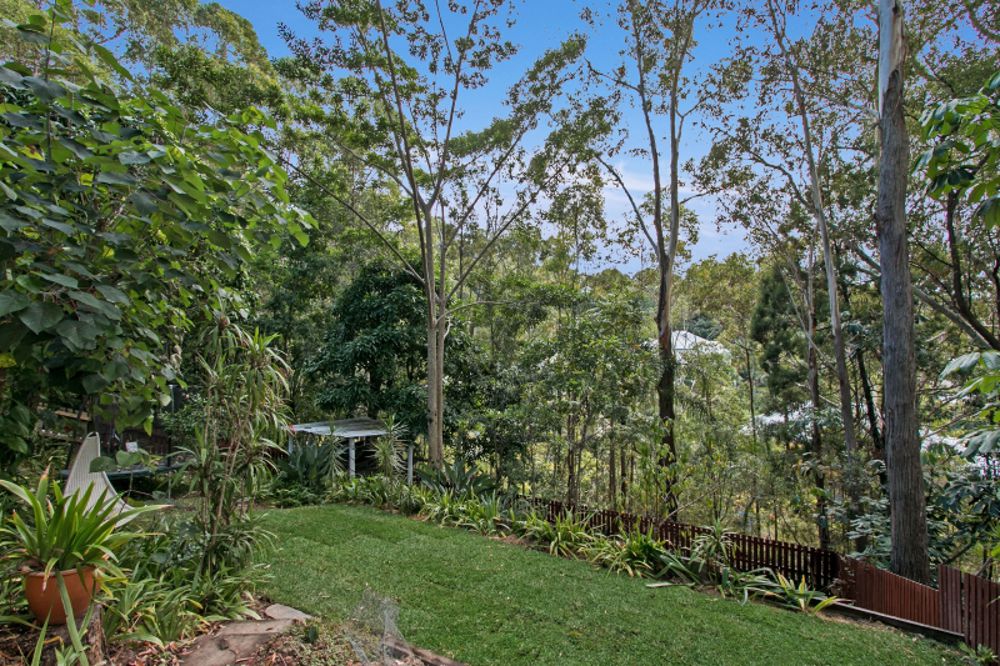 The ground floor comprises an open plan kitchen, dining and indoor/outdoor living spaces with polished timber floors, cathedral ceiling and French doors opening on to a side deck with access to a tiered and fully-fenced backyard. Downstairs is a large fourth bedroom, teenage retreat, music and media room, or guest accommodation, with its own bathroom and two decks leading to the garden. A flat grassed area, kids' cubby house, paw paw, mango, macadamia and peach trees make this an adventure playground ideal for immersing kids in nature.