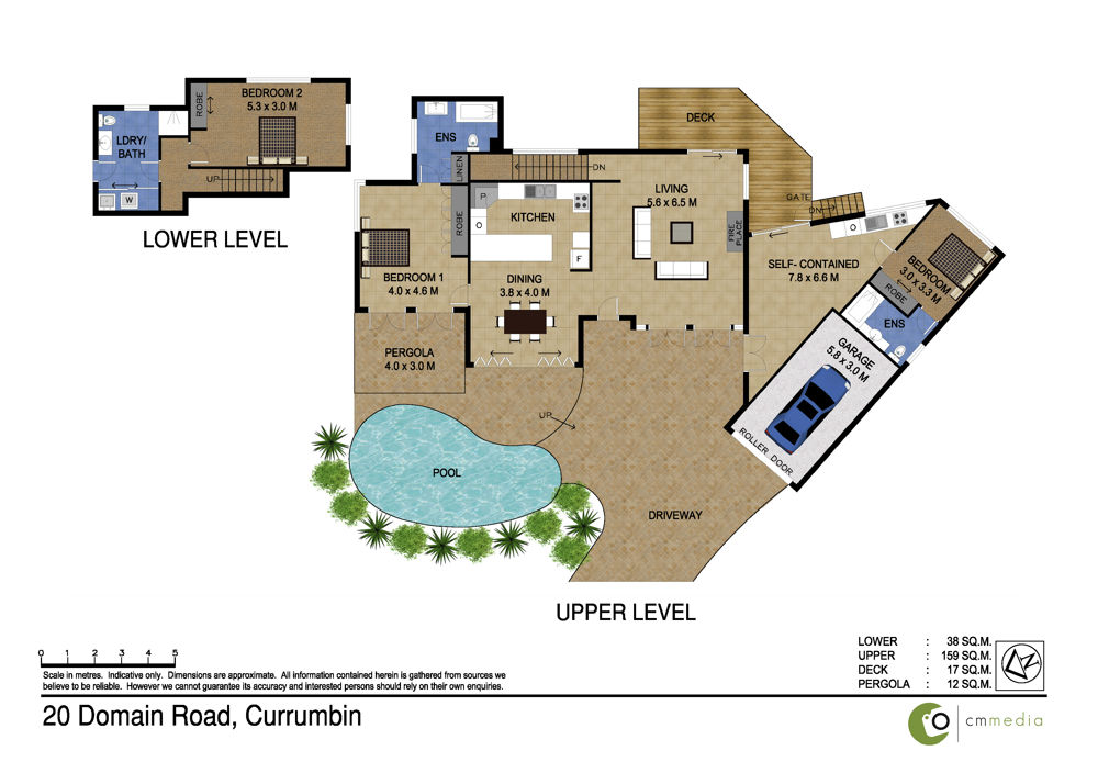 Privately located at the end of the home, the main bedroom also accesses the front patio and pergola area and boasts its own ensuite. A second bedroom and bathroom is located on the lower level.