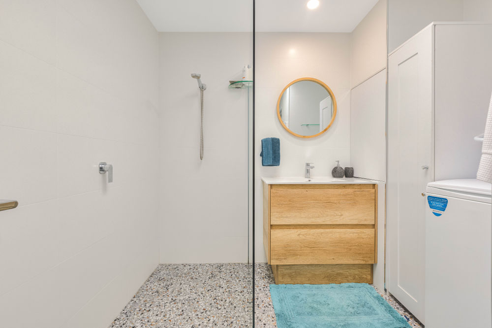 The well-proportioned bedroom offers an abundance of built-in storage, while the chic bathroom has been cleverly designed to incorporate a combined laundry for added convenience.