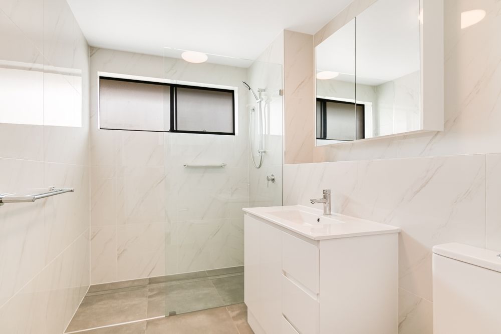 - Soft combination of greys and whites featured in renovated bathroom