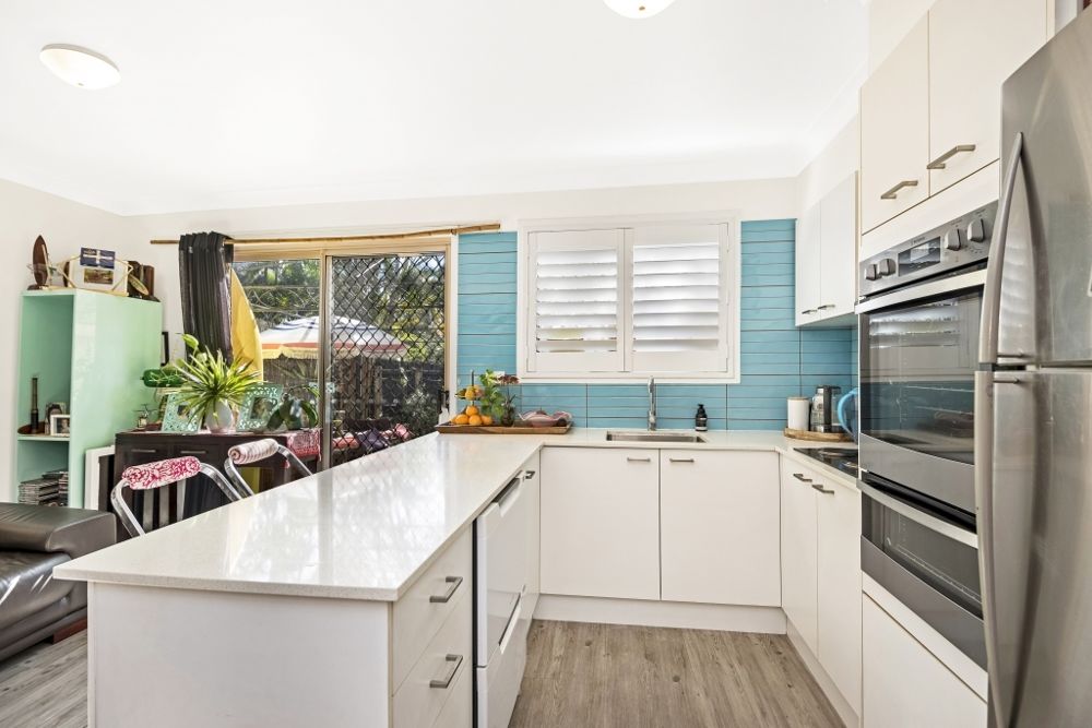 The kitchen has stone benches, a two drawer dishwasher, and modern appliances.