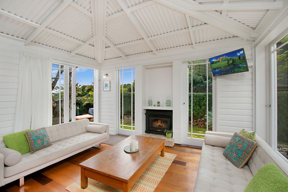 - light-filled sunroom, with its panelled sliding glass doors opening onto stone steps