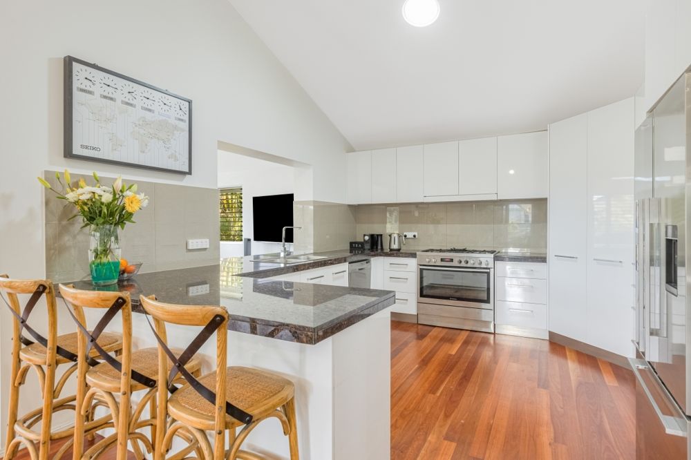 The kitchen is modern and central, complete with a gas cooktop, stainless steel appliances, a breakfast bar, rangehood, double-door fridge space, and abundant storage. A cosy fireplace adds warmth in the cooler months, and the upper level of the home enjoys a wonderful cross-breeze thanks to its clever design and elevated position.