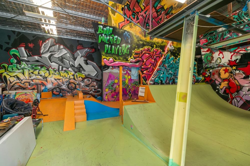 Large 18m x 12m colour bond shed with potential for an additional living space/home office & custom made indoor skatepark with one 5m drop half pipe, a flat ramp and other smaller ramps for the skater/scooter enthusiasts along with large amounts of storage.