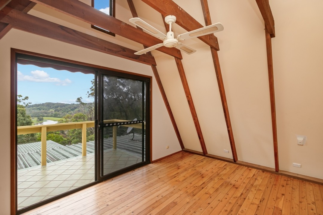 This dwelling has exposed rafters in the ceiling & contains 3 bedrooms, including an open loft style bedroom that you access from the open stair case to with stunning ocean & green valley views.