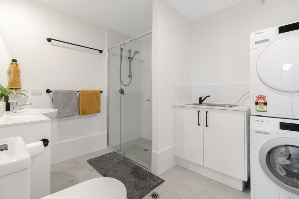 - laundry combined in bathroom with front loader washer and dryer