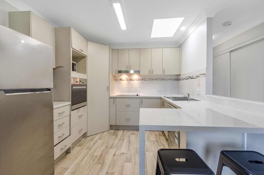 - Functional kitchen with dishwasher, ample storage and white stone bench-top