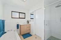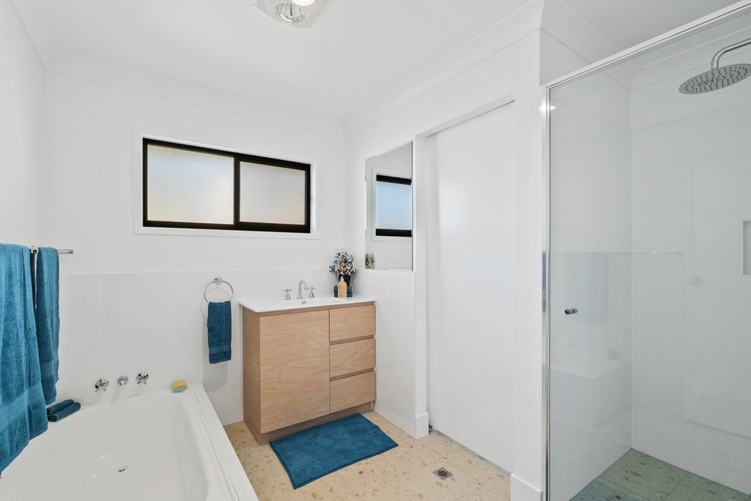 * Modernised bathroom complete with a shower, bath, and vanity.