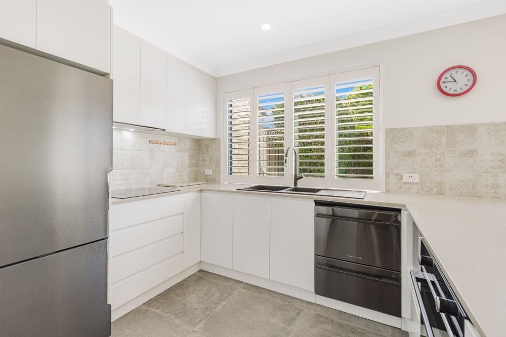 - stone benchtops line the modern kitchen with dishwasher and microwave