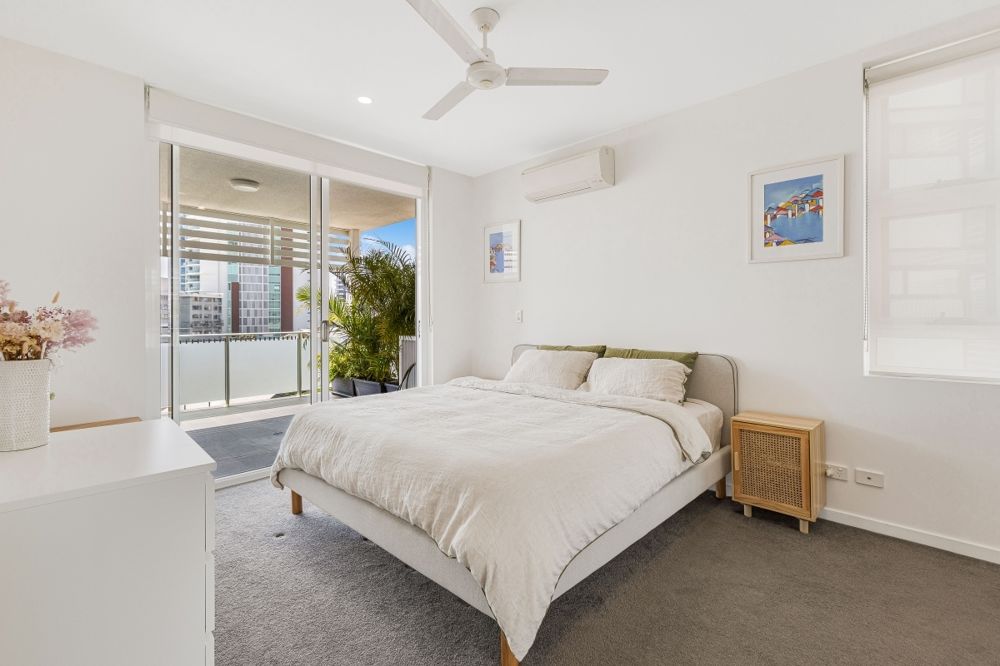 - Master bedroom features mirrored built-in wardrobe, ensuite bathroom, and direct access to the balcony.
