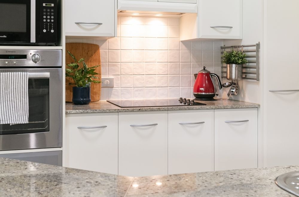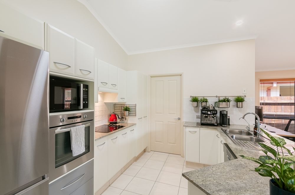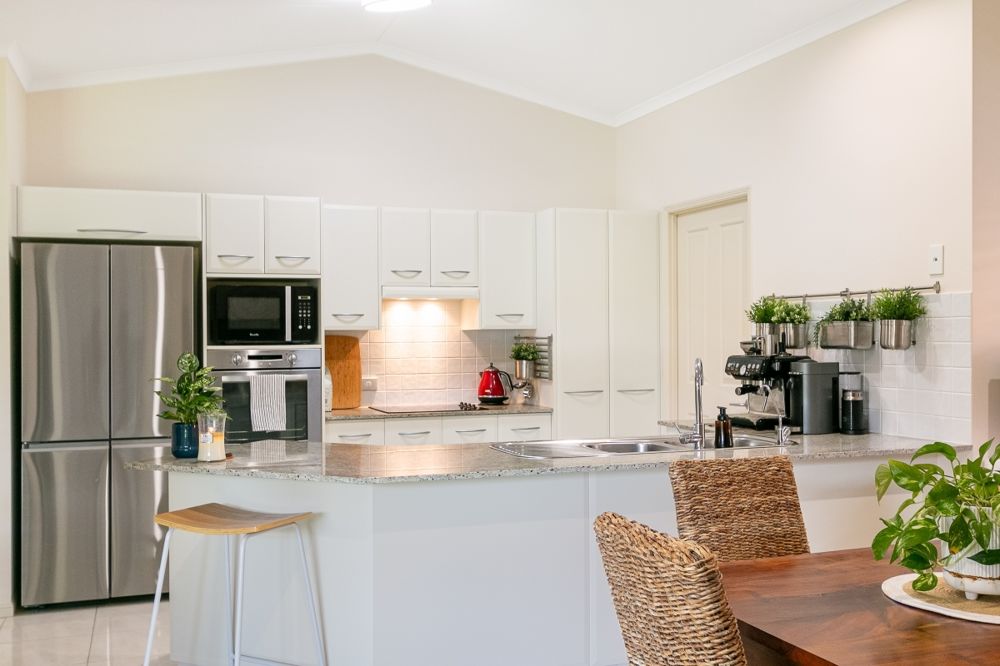 - Modern kitchen with stone bench tops, ample storage, and breakfast bar