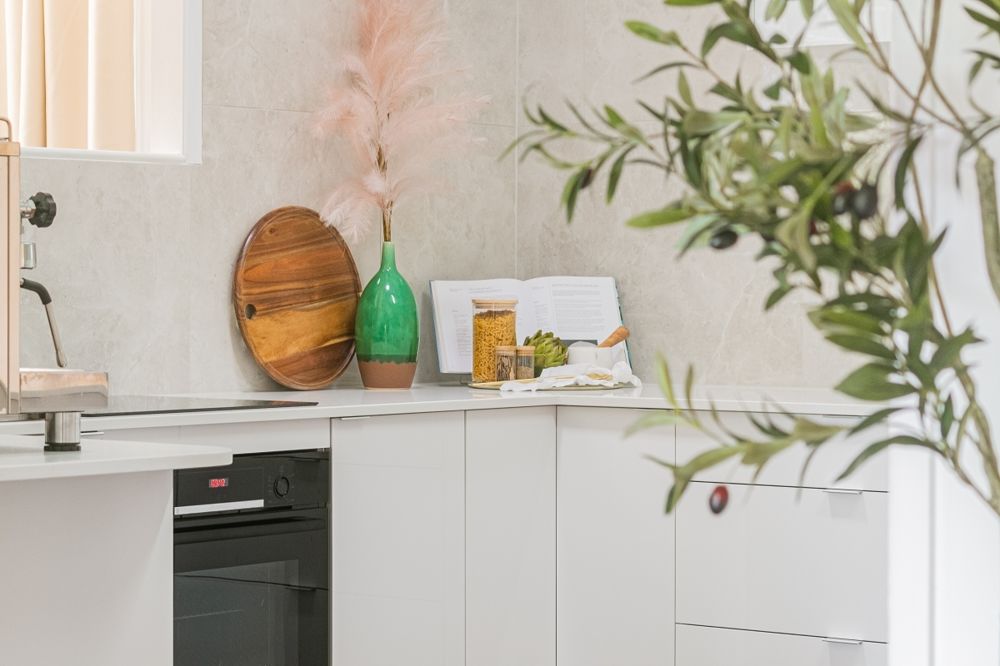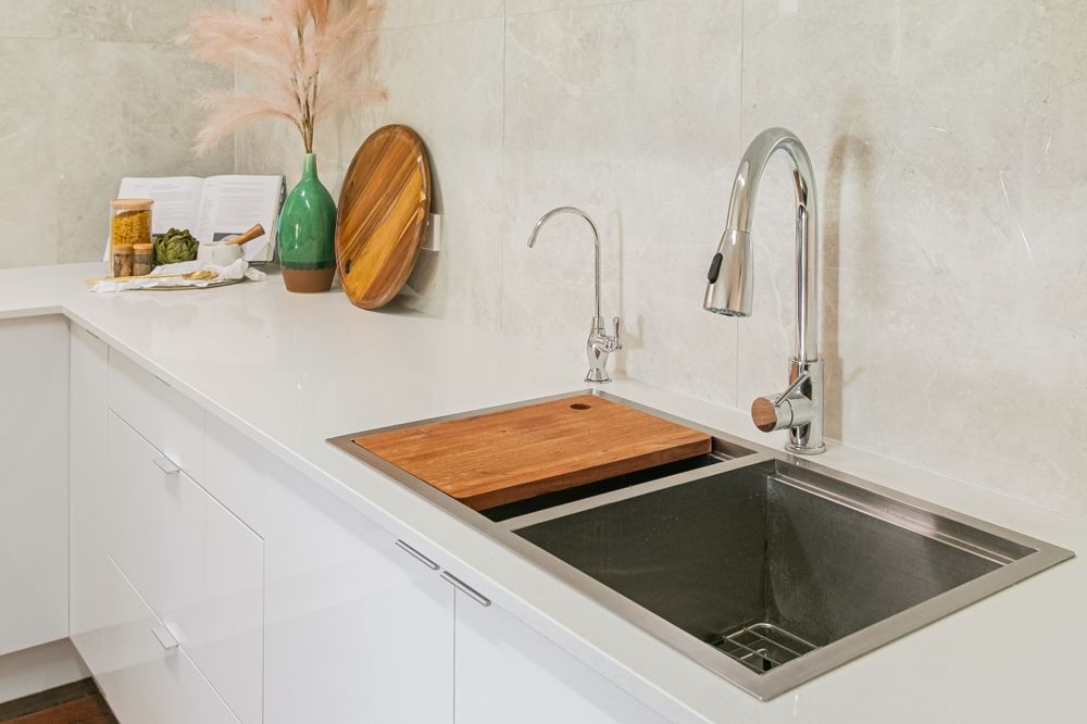skylight, silica free stone benchtops, water filtration tap, pull out bin drawer