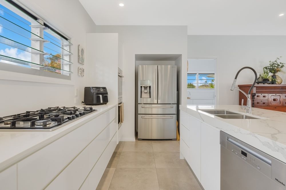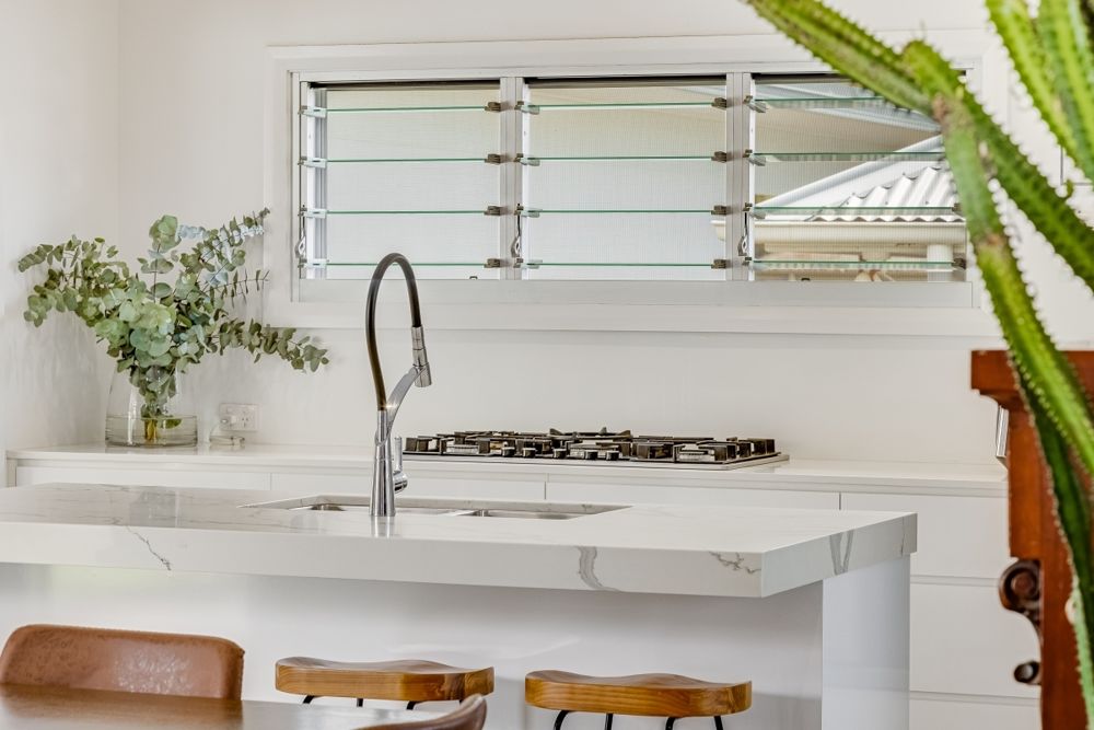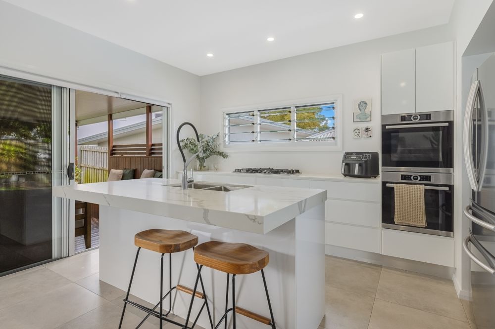 Kitchen with gas stovetop, stone island bench, double sink & access to outside deck area