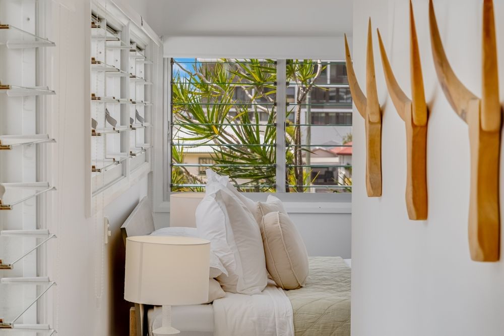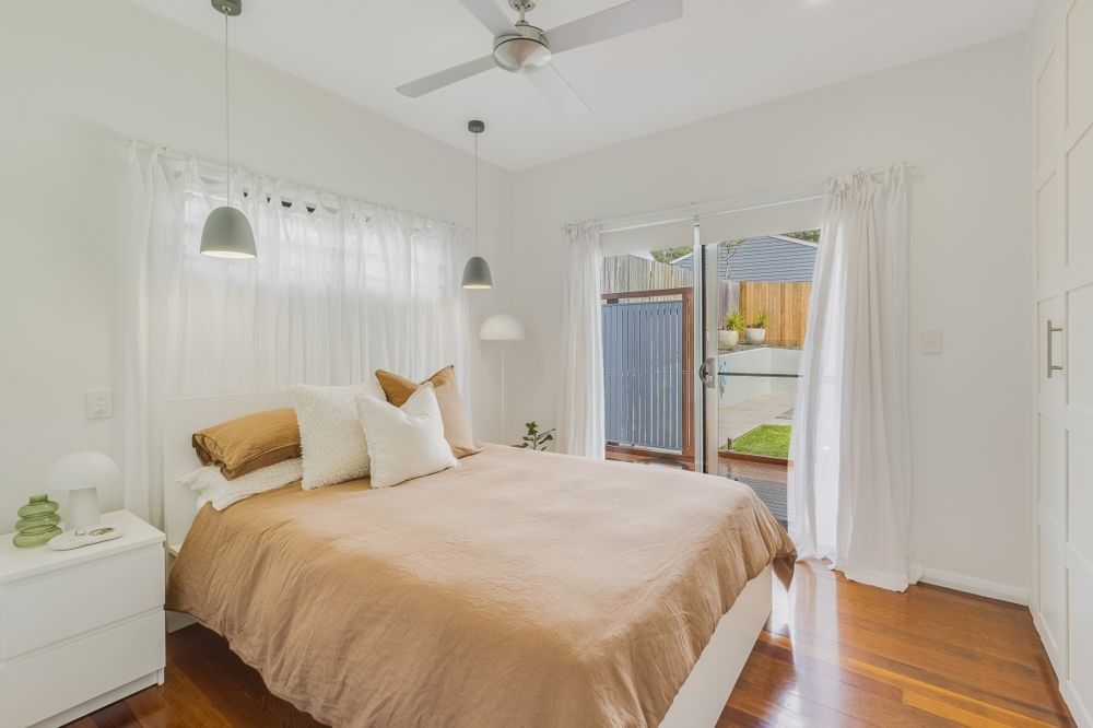 Second spacious bedroom with access to deck overlooking the pool with built in wardrobe & ceiling fan