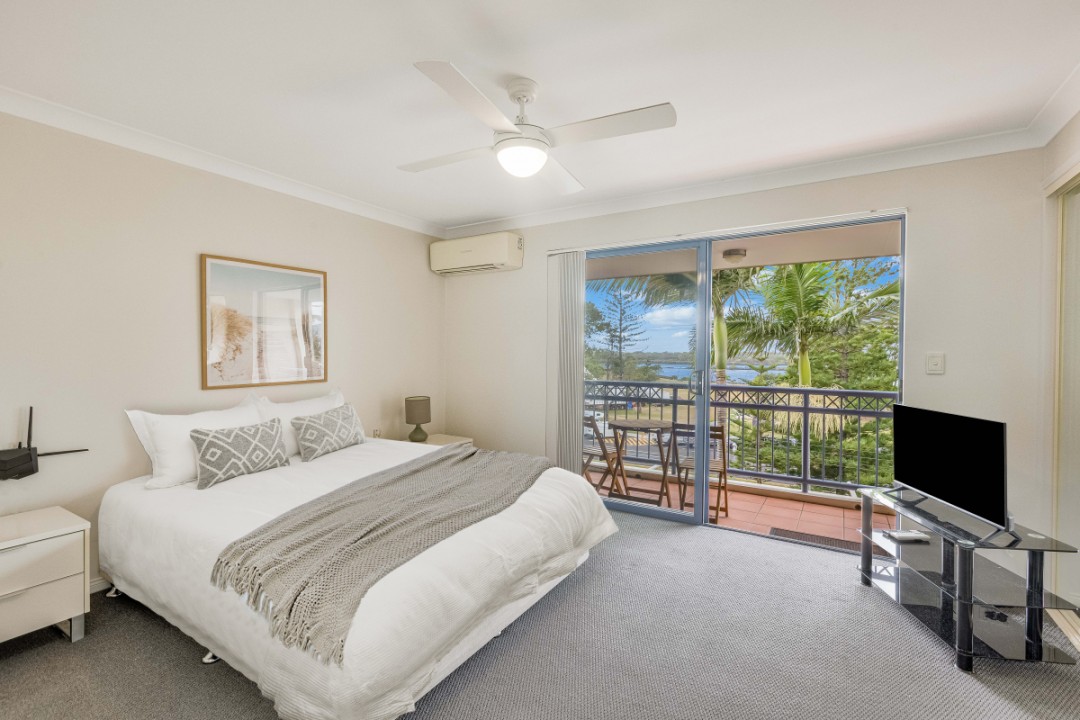 - Master bedroom with built ins and opening onto private balcony with water views
