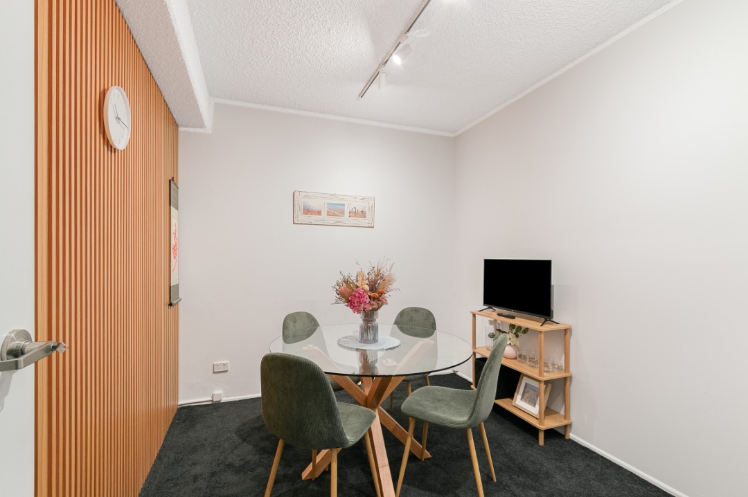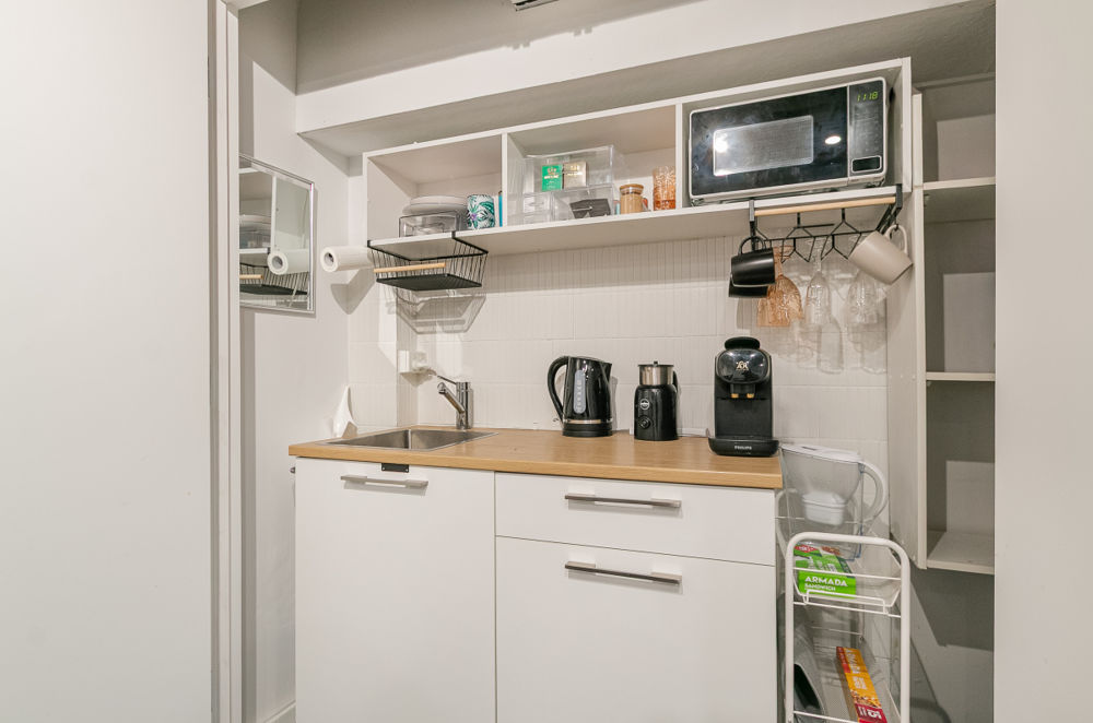 * Hidden Kitchenette Behind Timber Feature Wall