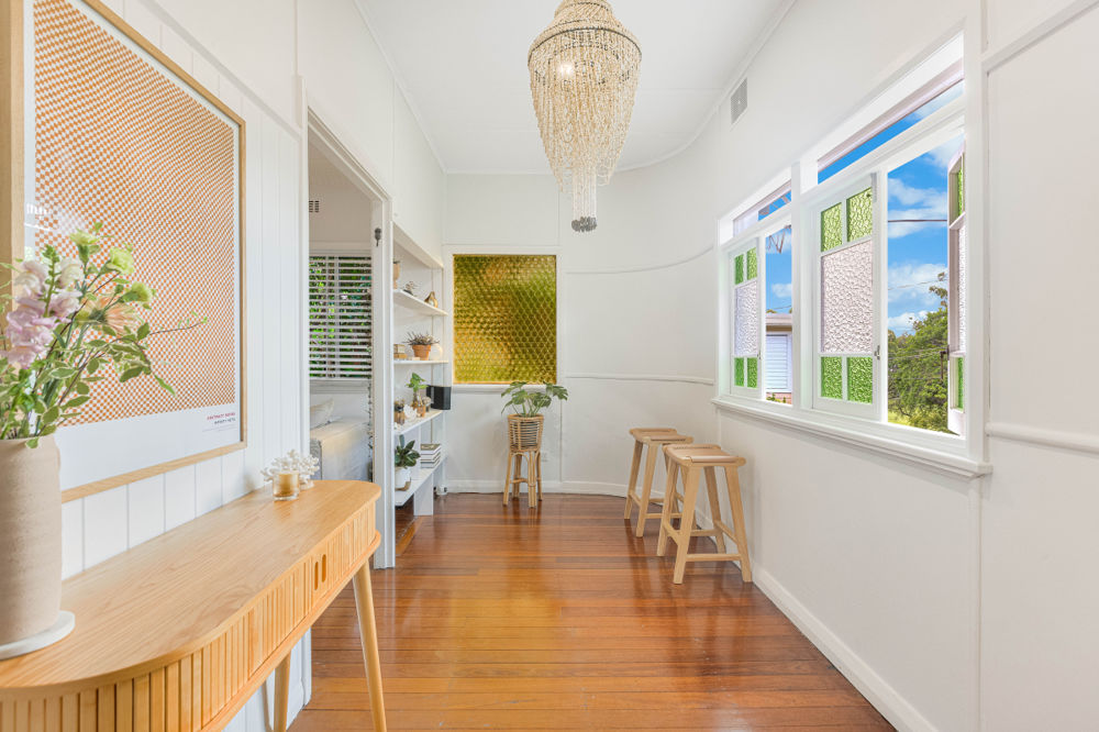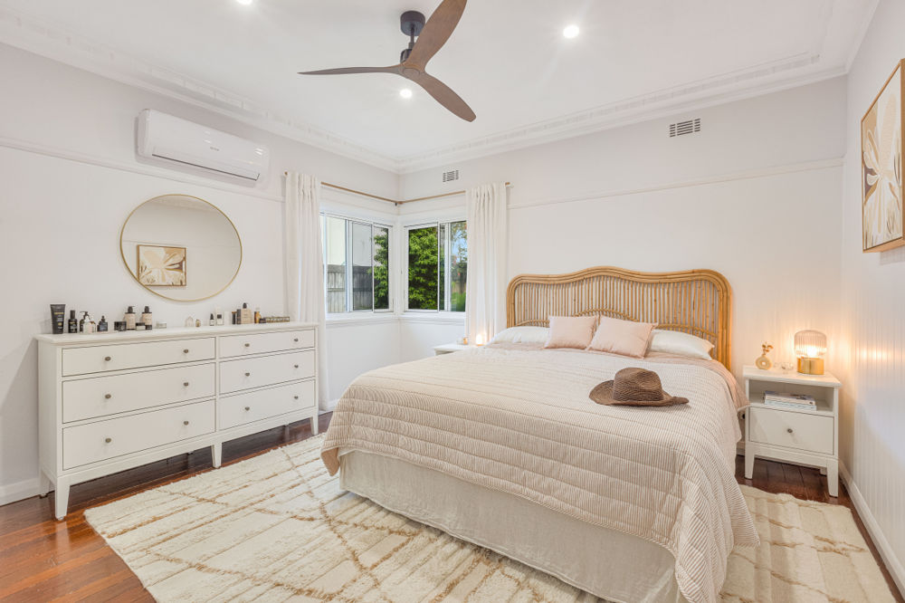 Inside, the home is light-filled and welcoming, with stunning stained glass windows and a warm, airy feel throughout. Subtle period features such as picture rails and VJ paneling add texture and character, while ceiling fans throughout and air-conditioned bedrooms provide year-round comfort. Meticulous attention to detail is evident in every finish, creating a cohesive blend of classic elegance and modern style.