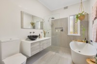 The home offers three generously sized bedrooms, two complete with built-in wardrobes, providing both comfort and practicality. The beautifully renovated bathroom is a standout, featuring a bathtub and quality finishes that complement the home's timeless style.