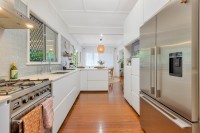 The stylish galley-style kitchen is both functional and inviting, featuring stainless steel appliances, a gas cooktop, and a convenient breakfast bar. Perfectly positioned, it enjoys a lovely outlook over the backyard and connects seamlessly to the open plan living and dining area. From here, timber French doors open out to the yard, creating a beautiful indoor-outdoor flow ideal for entertaining and everyday living.