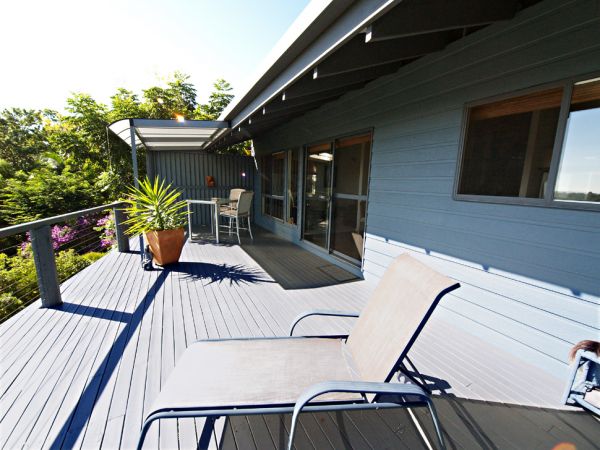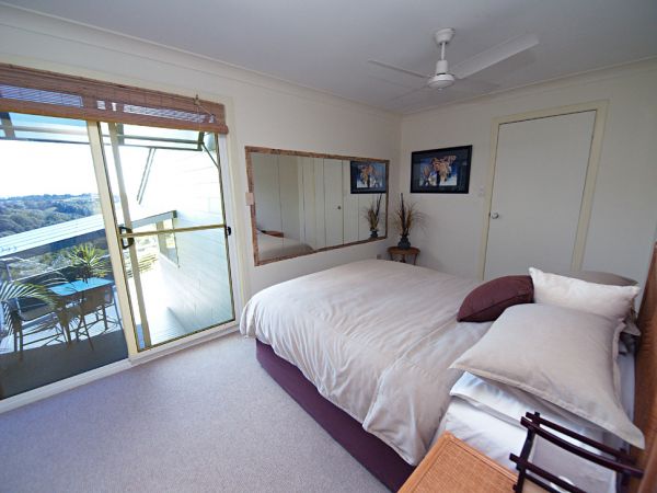 - The main bedroom features a walk in robe, ensuite, access to entertaining deck