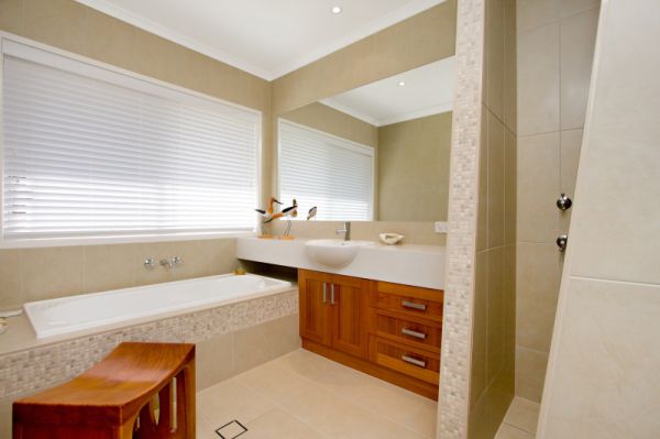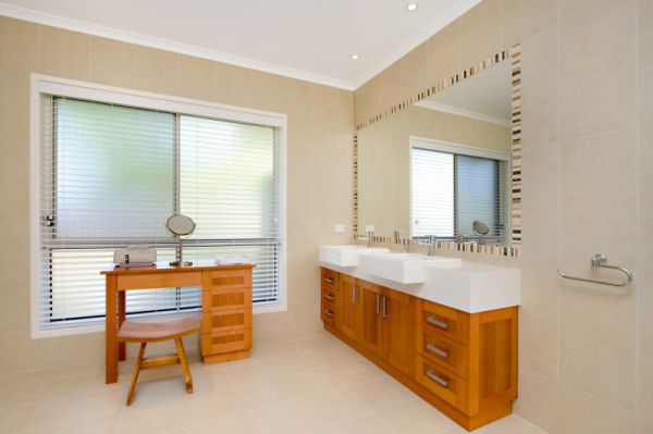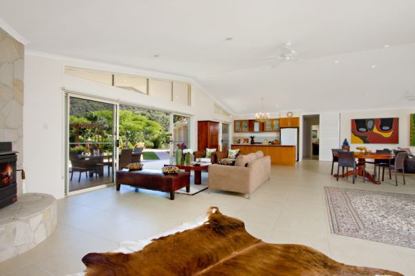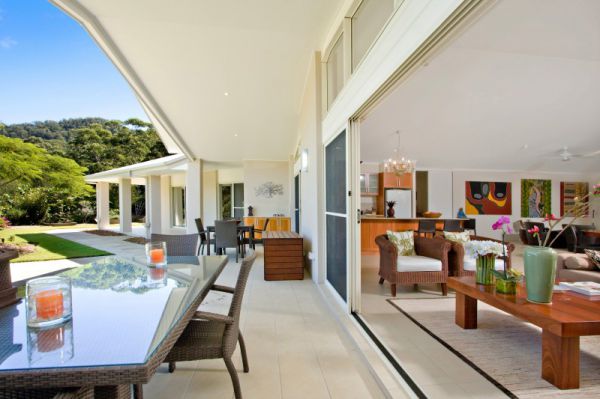 Vast sliding doors, high ceilings and many windows work to create the contemporary style of this airy, open home. Modern features such as shutters on the north side windows and finishes such as the detailed tiling and soft timber in the bathrooms complete the effect.