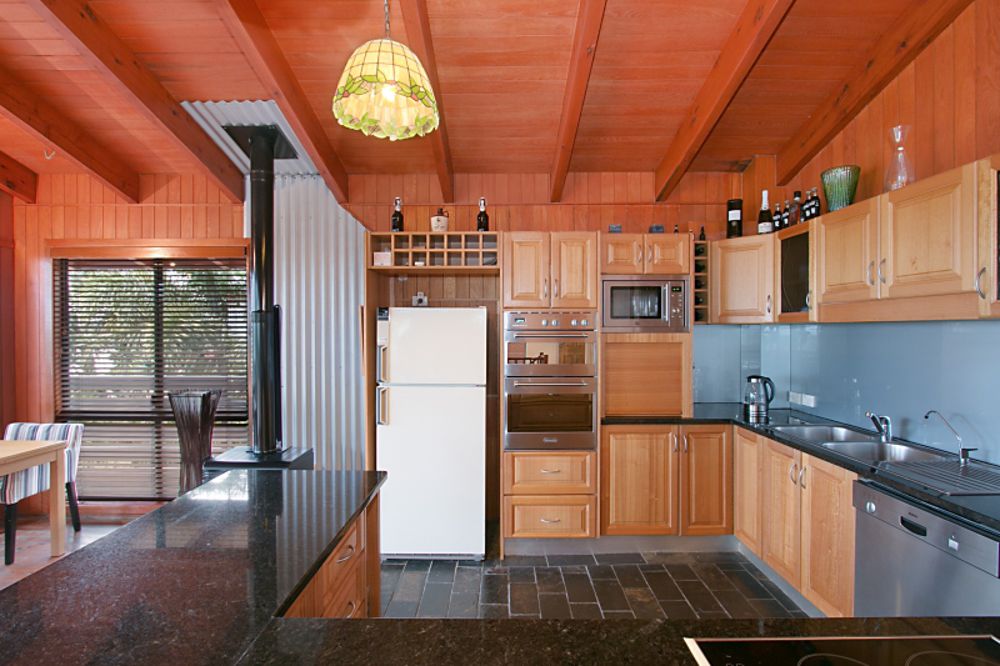 Bright, well equipped stone/timber kitchen complete with a glass cooktop