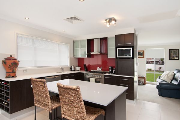 The open plan, tiled kitchen and dining area presents in fresh, modern tones. The functional kitchen offers striking glass splash backs, an ilive gas cook stove top and high quality stainless steel appliances including a double drawer dishwasher.