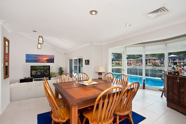 There is a separate, carpeted living area plus a sunken lounge which provides the perfect spot for relaxation or more formal entertaining with high vaulted ceilings and great views across the canal.