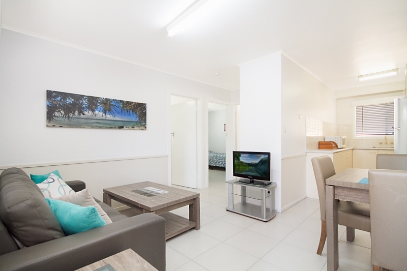 Neat and tidy ground floor 2 bedroom flat, with 1 double bed and 2 single beds, colour tv, off street undercover carpark, pedestal fans, community laundry with washing machine and ironing board, iron in each unit. close walk to beaches, clubs, retaurants, cafes and shopping.