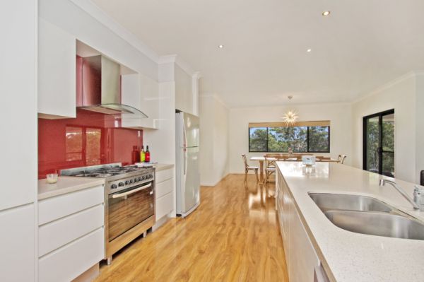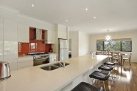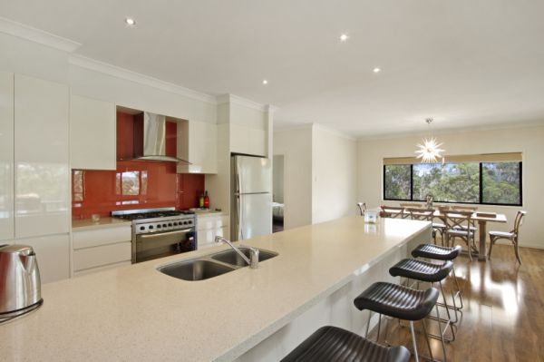 The stunning gourmet kitchen is perfectly designed, offering stone bench tops, a breakfast bar, striking glass splash back, stainless steel Omega dishwasher and a large 6 burner gas cook stove top.