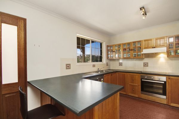 The lower level of the cottage style residence features the living areas. With a functional, timber kitchen (with stainless steel dishwasher) and separate living room with sliding door access to the front, covered patio with views.